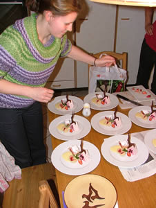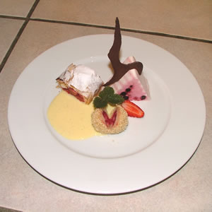 Daniela, a young friend of Sepp and Sonya’s who is currently learning to be a professional chef, is “studying” for her practical exam (which requires her to create a three-component dessert, including berries) by trying out her creations on us. The dessert consists of a blueberry-yogurt terrine, a berry strudel and a raspberry knoedel with vanilla sauce and a chocolate wafer.