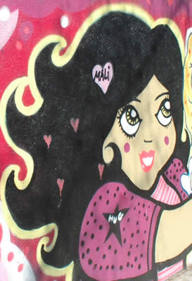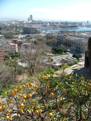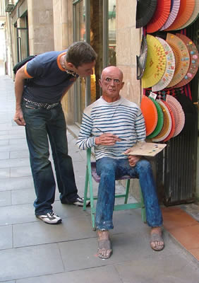 We walked to a hill with a view of the city, then to the now-deserted swimming venue from the 1992 Summer Olympics. From there we traipsed to the Placa del Rei where several 'urban' freeriders were riding down flights of stairs. At Placa de Espanya, we ducked into the metro and got out at a station near the water and walked past Frank Gehry's famous giant copper Peix sculpture and hung out on a wall overlooking the beach, where I took photos of a tree with leaves made of flattened beer cans. On the way towards lunch, we blitzed through an art gallery which featured photos of fruits with tiny people crawling on them, or dancing beside them....