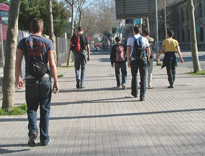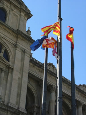 We ate oranges on some stairs overlooking the park, but headed down when it started to rain. The four of us descended back into the metro and zipped to the university district to visit Andreas's apartment -- a typical dark student home, homey, but in slight disrepair, worn furniture and, of course, the classic and necessary display of empty liquor bottles. Andreas, by the way, is studying Architecture, so Barcelona is a super place for him to be.