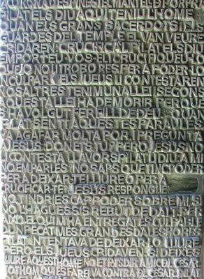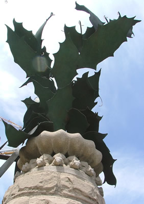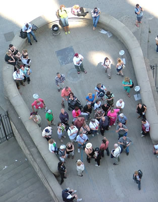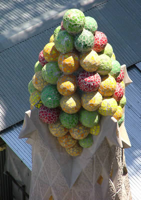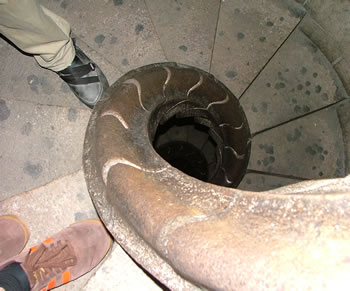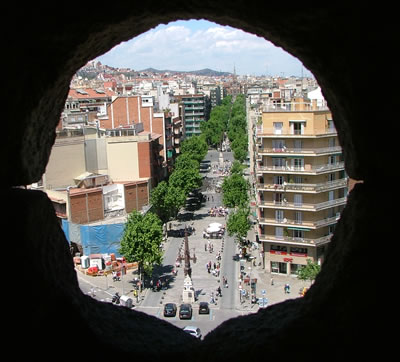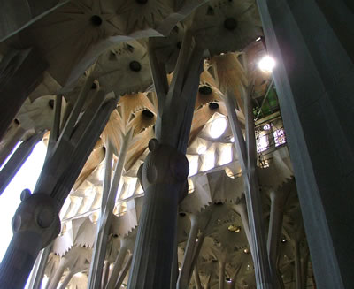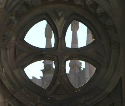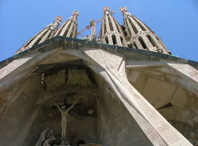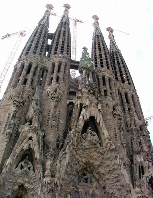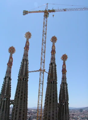 Gaudi's Sagrada Familia Temple: Top to Bottom, L-R: View of one of the entrances; View of another entrance; Organic sculpture -- classic Gaudi style; One of the Sagrada doors; Close-up of the tree sculpture above one of the entrances -- the doves are made of marble; Reflection of a window on an original part of the temple; Close-up of the mosaic balls that top several of the Sagrada's towers; Like a forest -- part of the interior that is under construction, following Gaudi's plans; The narrow staircase that we walked up in one of the towers; Looking down on gawking tourists from the tower; A crane above four of the Sagrada's towers (the plans call for 18 towers in all); A view of the city from one of the tower's balconies; View of towers through a portal; View of Barcelona from the tower.
