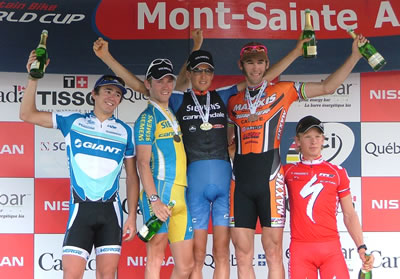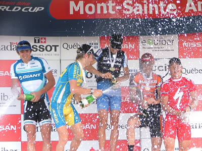 Photos (L-R) Geoff Kabush (CAN, Maxxis) on his way to a third-place finish; Fred Bussieres (CAN, Rocky Mountain-Business Objects), way to go!; Marti Gispert (ESP, Maxxis-MSC) Venga!; Ricky Federau (CAN, Gears Racing) Hey Ricky, you're so fine, you're so fine you blow my mind, hey Ricky!; Superfans during the men's race; Men's podium: Fourth place, Adam Craig (USA, Giant); second place, Fred Kessiakoff (SWE, Siemens Mobile-Cannondale); first place Christoph Sauser (SUI, Siemens Mobile-Cannondale); third place, Kabush; fifth place, Liam Killeen (GBR, Specialized); The boys on the podium celebrating with bubbly.